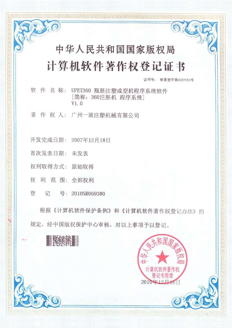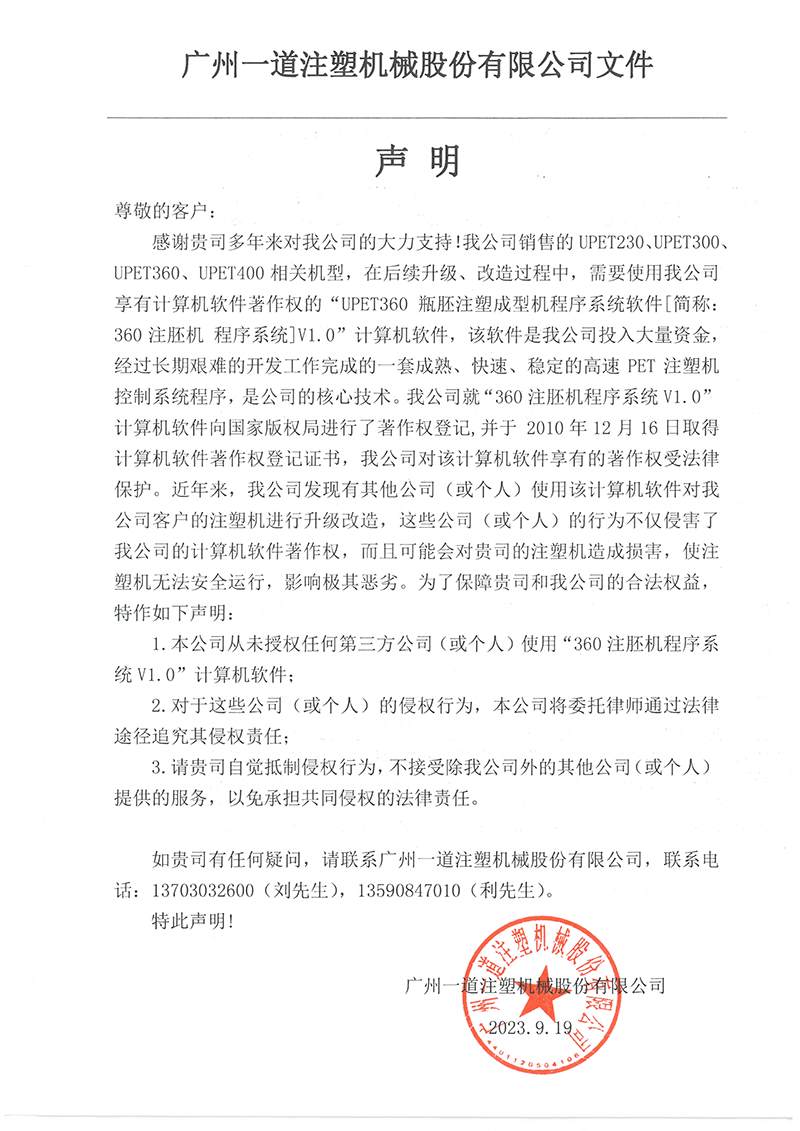 感謝貴司多年來對(duì)我公司的大力支持!我公司銷售的UPET230、UPET300、UPET360、UPET400相關(guān)機(jī)型,在后續(xù)升級(jí)、改造過程中,需要使用我公司享有計(jì)算機(jī)軟件著作權(quán)的“UPET360 瓶胚注塑成型機(jī)程序系統(tǒng)軟件[簡(jiǎn)稱:360注胚機(jī) 程序系統(tǒng)]V1.0”計(jì)算機(jī)軟件,該軟件是我公司投入大量資金,經(jīng)過長(zhǎng)期艱難的開發(fā)工作完成的一套成熟、快速、穩(wěn)定的高速PET注塑機(jī)控制系統(tǒng)程序,是公司的核心技術(shù)。我公司就“360注胚機(jī)程序系統(tǒng)V1.0”計(jì)算機(jī)軟件向國家版權(quán)局進(jìn)行了著作權(quán)登記,并于 2010年12月16日取得計(jì)算機(jī)軟件著作權(quán)登記證書,我公司對(duì)該計(jì)算機(jī)軟件享有的著作權(quán)受法律保護(hù)。近年來,我公司發(fā)現(xiàn)有其他公司(或個(gè)人)使用該計(jì)算機(jī)軟件對(duì)我公司客戶的注塑機(jī)進(jìn)行升級(jí)改造,這些公司(或個(gè)人)的行為不僅侵害了我公司的計(jì)算機(jī)軟件著作權(quán),而且可能會(huì)對(duì)貴司的注塑機(jī)造成損害,使注塑機(jī)無法安全運(yùn)行,影響極其惡劣。為了保障貴司和我公司的合法權(quán)益,特作如下聲明: